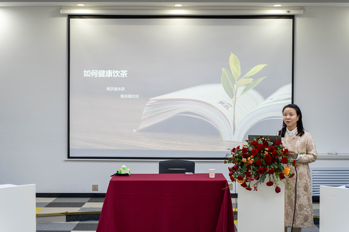 随后,田静在我校仁智书院学生活动中心开展以“茶与生活”为主题的专题讲座。讲座中她详细讲解了茶的发展史,阐述了如今茶与生活、茶与健康、茶与沟通交流等之间的关系。她从“行茶十式”,讲到功夫茶、闷泡茶、冷泡茶及茶道礼仪中蕴藏着的各种学问。她说“人生如茶,需要静心以待,沉时坦然,学会蓄力;浮时淡然,学会沉淀,沉住气,才能成大器。” 最后,田老师与大家深入交流互动,现场展示红茶闷泡的方法,并邀现场的同学和老师一同细品红茶、绿茶、白茶在不同冲泡方法下的差别。