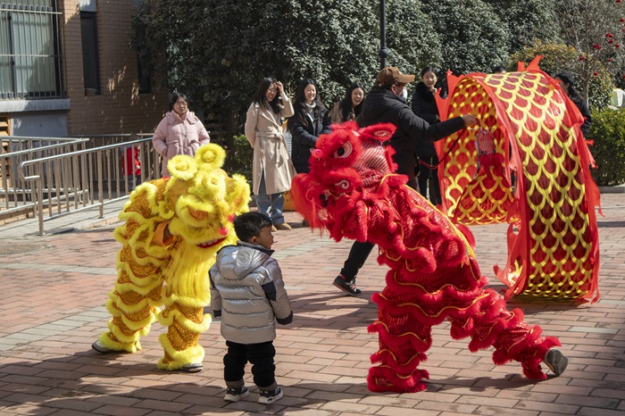 其中最为精彩的是“瑞兽呈祥,龙狮送福”环节。“一点左眼金:金光闪闪。二点右眼银:银光灿灿。”伴着崇德书院党总支副书记杨翠苹把朱砂涂在狮子的眼睛上,现场锣鼓宣扬,被点睛的狮子仿佛被赋予了生命,变得生龙活虎。“咚锵~咚咚锵~”,瑞兽“龙狮”在铿锵有力地鼓声中摇头摆尾,像是在向大家问好。一条条锦色的长龙在广场内翻腾起舞,带动了现场的欢腾。一红一黄的狮子时而兴高采烈眨眨眼睛、时而张牙舞爪愤恨发恶,精神抖擞,辗转腾挪,忽而从嘴巴里吐出一副对联,顿时掌声四起,现场氛围达到高潮。22级本护刘柯阳说:“以前在电视上看舞狮表演觉得很轻松,自己舞动时才发现原来这么难啊,没有练习过肯定不会舞的这么好看。”