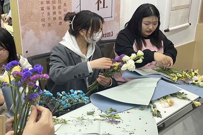 在接下来的插花环节中,大家认真地聆听指导老师讲解鲜花的特点、花语,以及插花步骤、插花小技巧等知识,并跟着老师的步骤,通过适当的修剪及装饰,将一朵朵鲜花错落有致地插在花篮中,完成自己的独特花束。在诗词创作环节,同学们结合清明节主题进行诗词创作,或是诵读分享自己喜欢的清明节诗词。2022级助产学专业的王梦瑶同学说:“‘清明时节雨纷纷,路上行人欲断魂’,清明节不仅是祭祖、缅怀先烈的节日,更是我们铭记历史苦难、努力奋斗建设祖国的提醒。”2023级护理学专业的刘芮同学说:“花艺和诗词艺术提升了我们对美的综合素养,通过本次活动,使我们感受到了中国传统节日之美、中国传统诗词文化之美。作为新时代的大学生,我们有责任与义务继承与发扬中华优秀传统文化,坚定文化自信,为建设文化强国贡献自己的力量。”