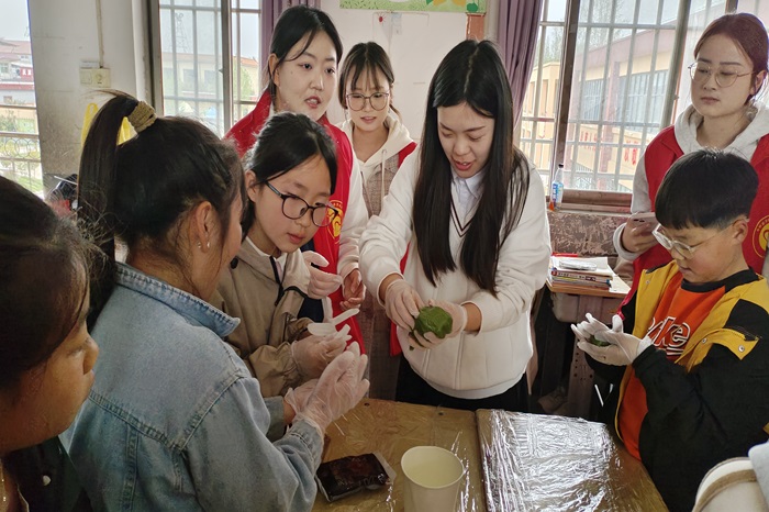 4月2日下午,崇德书院志愿者前往姚村小学举办“清明化成雨,思念延绵长”志愿服务活动。志愿团队通过生动有趣的方式向学生们讲述了《奶奶的青团》这一绘本故事,带领他们一起了解清明节习俗,学生全神贯注地聆听着。讲完之后志愿者们又对学生们进行提问,“绘本中除了做青团,大家还看到有什么清明节活动呀?”“拔河、踢毽子、踏青、插柳......”学生们争先恐后的答道。随后,志愿者教学生们制作青团,大家有模有样地学着志愿者的动作,揉面、包馅、压膜,忙得不亦乐乎。不一会,几十个青团就做好了。志愿者张家梦说到:“清明节,其实不仅仅是一个传统节日,也是一个教育小学生的好机会,我们一定要抓住这个机会,帮助他们学习传统文化,感受传统节日的仪式感。”