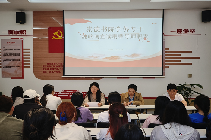 接着,魏欣珂宣读朋辈导师队伍职责,从思想引领、学业帮扶、即时反馈学生诉求三个方面提出了具体要求,如:定期通过宣讲、座谈等形式宣传党的思想;制定学生问题台账,动态化监测学生舆情;在突发情况时,配合楼层安全员进行应急处置等。