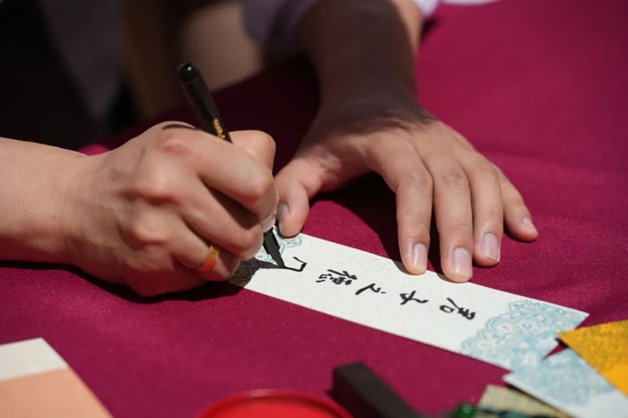 随后,伴随着悠扬的古琴声,甘棠汉服社成员身着各具特色的汉服依次出场进行汉服展示,引发了现场师生的一片欢呼和掌声。在自由活动环节,同学们踊跃参与了自制书签、石膏涂鸦、套圈与非遗漆扇制作等项目,活动现场欢声笑语,同学们在丰富多彩的活动中体会了传统文化的魅力。刘芮同学现场演示了书签的制作过程,用笔在书签上写下“多喜乐,长安宁”六个字,寄托祝愿大家生活都喜乐安宁的深意。另一边,在历史人物石膏人涂色活动中,康博同学选中了李白的石膏形象,因为特别欣赏李白‘仰天大笑出门去,我辈岂是蓬蒿人’的豁达。非遗漆扇制作最受学生欢迎,同学们领取空白扇子后在活动摊位前排起了长队,空白的扇子浸入水中又取出便成为了精美的艺术品,无论男生还是女生都爱不释手