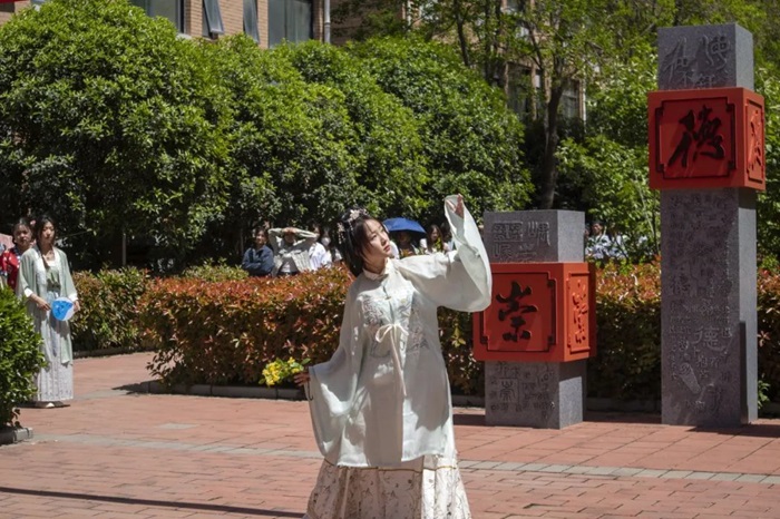 最后是诵读经典环节。“子曰:学而时习之,不亦说乎?有朋自远方来,不亦乐乎?人不知而不愠,不亦君子乎?”学生们身着传统服饰,声情并茂地朗诵着孔子的《论语》,赢得现场观众的阵阵掌声。听完诵读后,尹天宇同学激动的说道:“看到同学们身着汉服诵读经典和自己读书时有着完全不同的体验,仿佛身临其境回到了古代书院,在那一瞬间与圣人的思想产生了共鸣。”