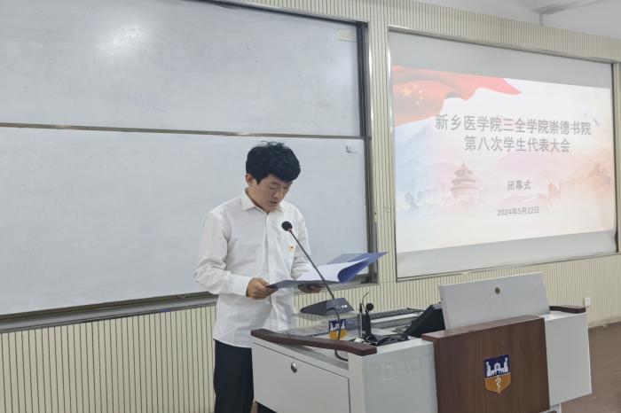 本次学代会分预备会、开幕式、正式会议和闭幕式四部分进行。21日上午预备会上,汇报了大会筹备情况,审议通过了《新乡医学院三全学院崇德书院第八届学生代表大会议程(草案)、《新乡医学院三全学院崇德书院第八届学生代表大会资格的审查报告(草案)》,听取了《新乡医学院三全学院崇德书院第八届学生代表大会提案工作报告》,表决通过了学代会主席团建议名单、大会总监票人及监票人建议名单、大会总计票人及计票人名单等内容。
