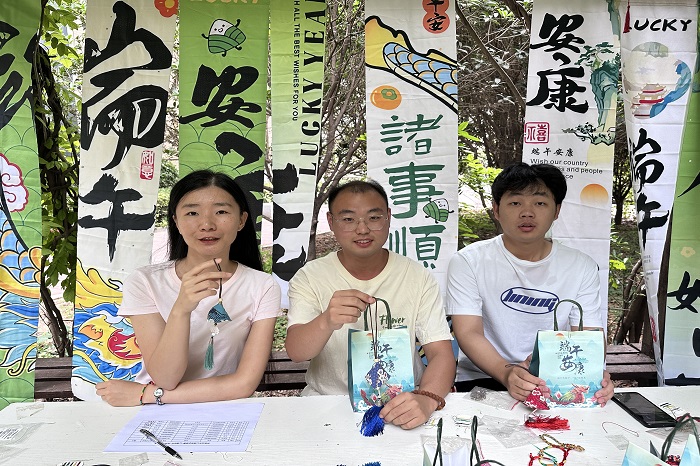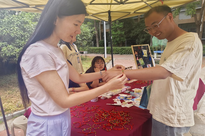 活动开始,支部书记王沥滢为大家讲述了端午节习俗和爱国诗人屈原的故事,激发了大家的爱国热情和民族情怀,共同感悟中华民族博大精深的传统文化,现场气氛一片融洽。接下来,大家一起制作、互赠端午节香囊、五彩绳,通过沉浸式体验传统文化手作活动,感受中华优秀传统文化之美。支部书记王沥滢将其制作的五彩绳赠与毕业生党员康龙生,并祝愿其平安、顺利,在今后的工作岗位上继续发光发热,发挥好一名党员的引领作用。
