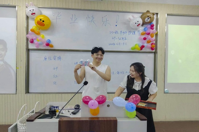 独属于20护理247名学生的惊喜不止于此,伴随着轻柔的音乐,一段段珍贵的影像在屏幕上展开。这是一段由同学们四年来点点滴滴的照片剪辑而成的视频,当视频播放结束,全场响起了热烈的掌声。视频制作者胡心甜感慨地说:“这段视频记录了我们从青涩的新生到成熟的毕业生,承载了我们青春的记忆,如同一条隐形的纽带,将每个人的心紧紧相连。”