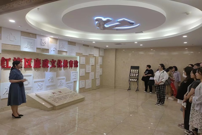 在讲解员的介绍引导下,大家依次参观了“廉史流韵”、“廉洁之路”、“警钟长鸣”、“红旗高扬”四个主题展厅,通过听讲解、观看视频、浏览图文展板等多种形式,深入学习了中国共产党的百年奋斗历程和党风廉政建设历程,回顾了解了我国历代的廉政文化、反腐措施、勤廉典型和中国共产党成立以来的反腐历程,以及红旗区悠久的历史文化和新时代发展成果,让党员干部们在“沉浸式”学习体验中进一步学党史、明党纪、知行止、存敬畏。这些典型案例图片、文字和视频,呈现了一幅幅鲜活的画面,让同志们切实感受腐败带给个人和家庭的巨大伤害,深切感受到以习近平同志为核心的党中央从严治党和反腐治腐的坚定决心和有力举措,切实提高自身“不想腐”的思想自觉。最后,全体党员干部面对党旗重温了入党誓词,提醒大家不忘入党的初心使命。