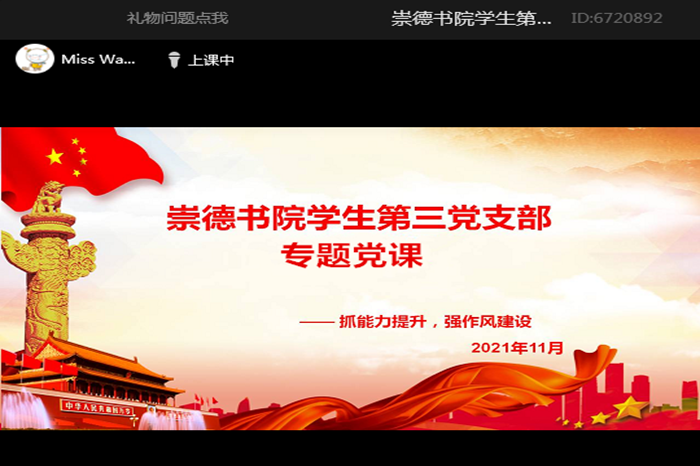 为进一步增强支部党员的作风建设,不断提高理论知识和办事能力,以优异成绩喜迎建党一百周年,以昂扬姿态奋力冲刺新的百年,崇德书院学生第三党支部于2021年11月11日以腾讯课堂的方式开展“抓能力提升,强作风建设”专题党课。
