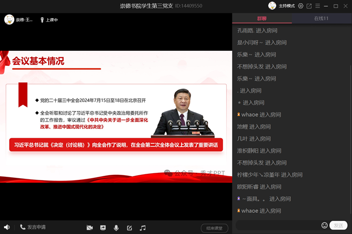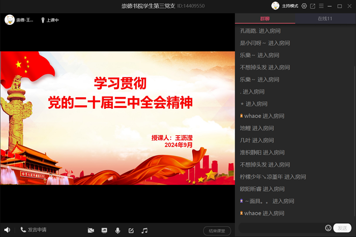 在新时代的浩荡春风中,党的二十届三中全会胜利召开,犹如一座灯塔,为党和国家事业发展擘画了新蓝图、指明了新方向。为深入学习贯彻党的二十届三中全会精神,增强广大党员学习贯彻党的二十届三中全会精神的思想自觉和行动自觉,9月6日下午,崇德书院学生第三党支部开展学习贯彻党的二十届三中全会精神专题党课。