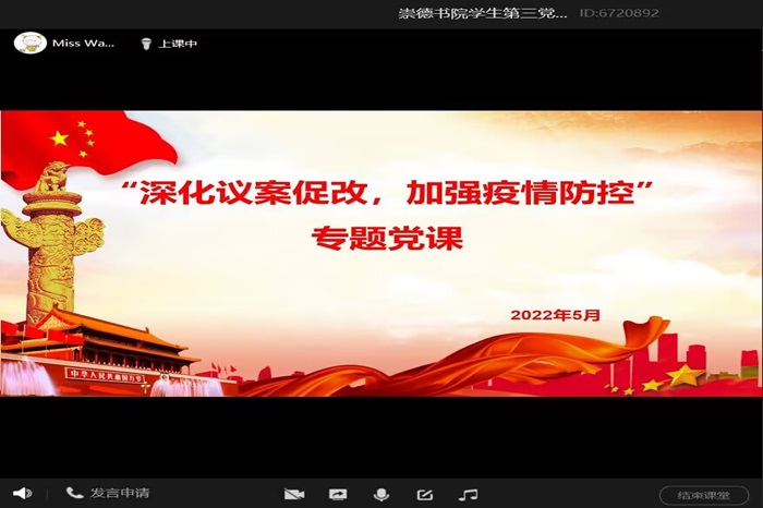 2022年5月17日上午10时 ,崇德书院学生第三党支部在腾讯课堂召开以“深化以案促改,加强疫情防控”专题党课。崇德书院学生第三学生党支部全体党员参加本次学习。