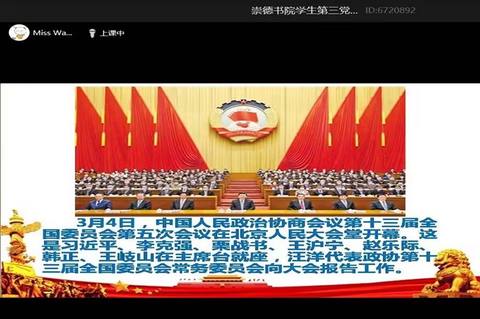 为更加紧密地团结在以习近平同志为核心的党中央周围,向着中华民族伟大复兴的光辉彼岸奋力扬帆,崇德书院学生第三党支部于3月15日晚通过腾讯课堂召开“学习两会精神,凝聚奋斗力量”主题党课,深入学习2022年全国两会内容、紧密联系支部同志们的思想和工作实际。此次主题党课由支部书记王沥滢同志主讲,支部全体党员同志参加会议。