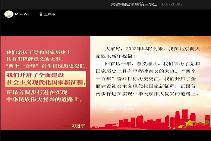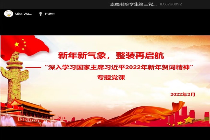 为深入学习贯彻国家主席习近平2022年新年贺词精神,引导支部党员沿着习近平主席指引的方向奋力前进,2月23日下午,崇德书院学生第三党支部组织开展“深入学习国家主席习近平2022年新年贺词精神”专题党课,党课由支部书记王沥滢同志主讲,支部全体党员参加。