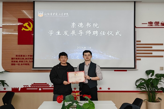 邓仁丰以自身的成长经历为切入点,分享了大学时期的校园经历和职业发展的心路历程。他强调,在大学期间要对医学检验技术专业的行业现状和职业发展有一个清晰的认识,才能够做到目标明确,从而制定好成长计划,提升个人综合素质和职业竞争力。接下来,邓仁丰为同学们分析了当前医学检验技术专业的行业发展现状和就业环境,鼓励同学们要树立正确的就业择业观,不要只盯着医院,要看到当前民营企业、第三方检验公司的蓬勃发展,同时鼓励大家在确定就业目标后,要切实制定成长计划,并注重付出实际行动,逐步提升自我。最后,崇德书院聘任邓仁丰为学生发展导师,院务主任张晟烨为邓仁丰颁发聘书。