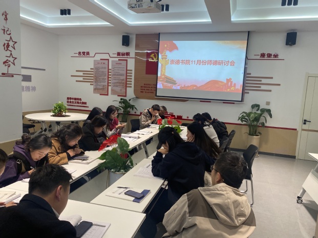 在教育的广阔天地中,师风师德始终是指引教师职业发展的北斗星。为了进一步强化教师队伍的道德建设,提高教师的思想政治素质,11月15日,崇德书院在党建工作室举办了一场以“师风润心,塑造未来教育新气象”为主题的师德师风建设专题讲座。此次活动由崇德书院党总支副书记杨翠苹主持,全书院教师积极参与,共同探讨新时代教师的道德修养与职业发展。