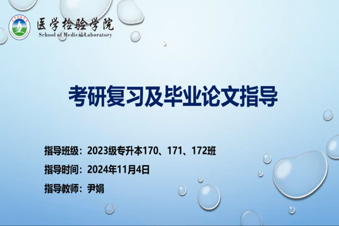 学业导师尹娟在腾讯会议为 2023级医学检验技术专升本170-172班毕业生开展了实习阶段性问题总结、毕业论文推进情况及考研复习指导。尹娟强调按大纲要求轮转科室并做实质性工作,遇到问题需及时向学校反映;认真对待毕业论文,在实习中收集文献资料和临床数据,必要时联系指导老师;距考试还有1个月,考研学生要按节奏稳步前行,必要时略作调整。