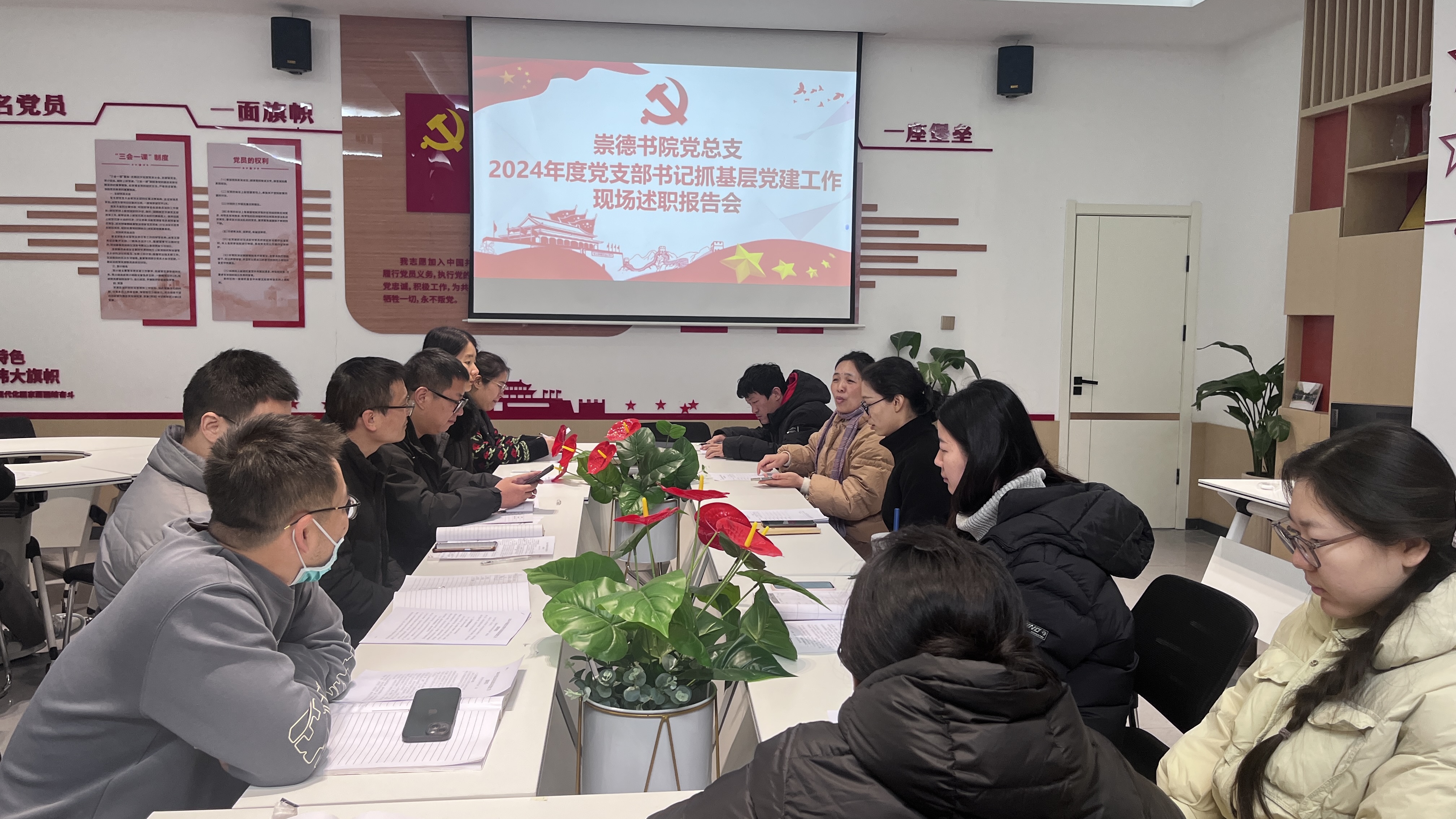 为深入学习贯彻习近平新时代中国特色社会主义思想和党的二十大、二十届三中全会精神,认真践行新时代党的建设总要求和新时代党的组织路线,充分发挥党支部战斗堡垒作用,提升党支部书记综合素质和履职能力,根据学校《2024年度基层党组织书记抓基层党建述职评议考核工作方案》要求,2024年12月24日上午,崇德书院党总支在党建活动室召开2024年度党支部书记抓党建工作述职评议考核会。书院党总支委员、党支部书记和学生党员代表参加会议,会议由书院党总支副书记杨翠苹主持。