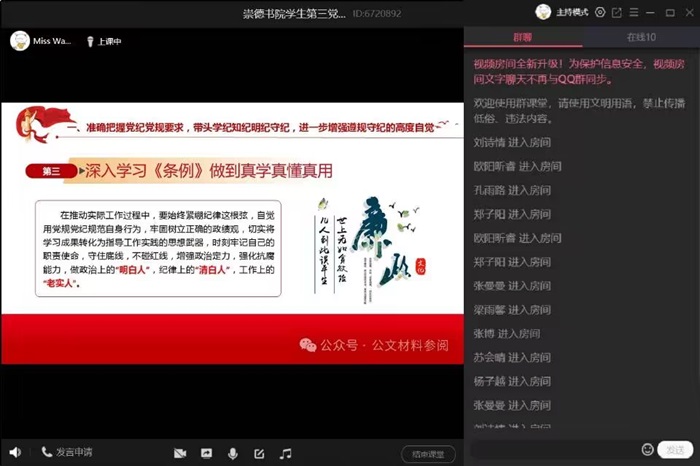 为认真贯彻落实习近平总书记关于党纪学习教育的重要讲话和重要指示精神,深入学习贯彻新修订的《中国共产党纪律处分条例》,学生书院学生第三党支部于1月12日晚通过腾讯课堂开展了党纪学习教育党课。