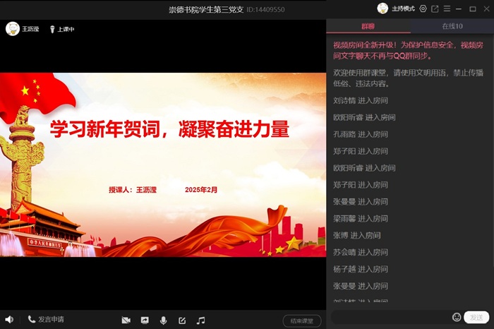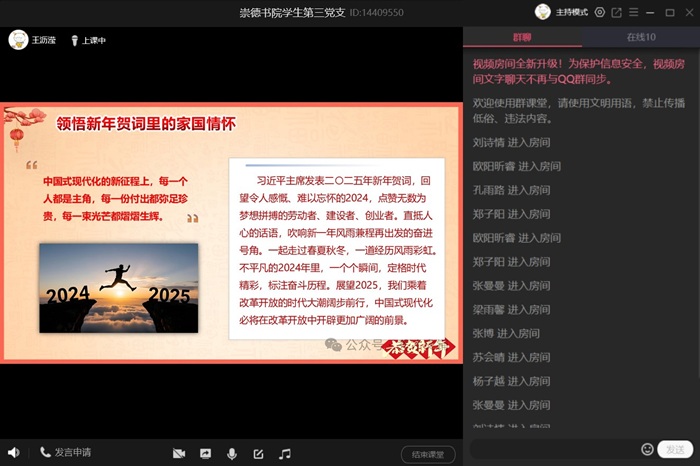 学习新年贺词,凝聚奋进力量,2025年2月20日,崇德书院学生第三党支部开展以“习近平总书记二〇二五年新年贺词”为主题的专题党课,本次专题党课由支部书记王沥滢主讲。