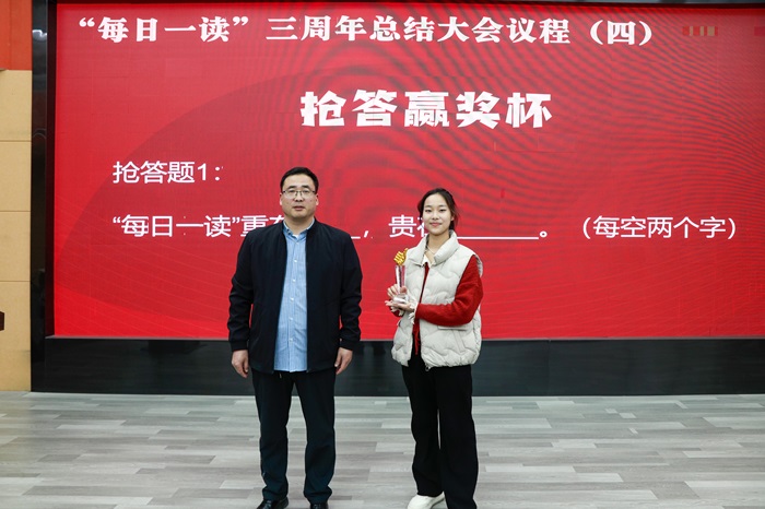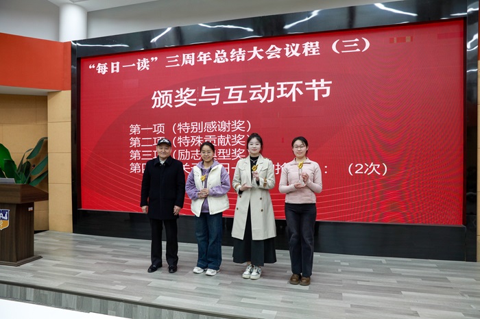 致辞环节,顾欢代表学校对“每日一读”三周年总结会给予了高度赞扬,并提出殷切期望。他对三年来外国语学院与崇德书院携手打造这一独具特色的第二课堂、为上百名学子搭建的语言精进的阶梯表示感谢:“‘每日一读’之所以珍贵,不仅在于它帮助同学们掌握了一门语言,更在于它悄然重塑着大家的学习基因——当清晨诵读成为习惯,当坚持化为自律,同学们收获的是一生受益的学习品格,这种“死磕”背后,是对目标的敬畏与执着。”随后,大会进入颁奖与互动环节。顾欢、端木庆一、刘海霞分别为崇德书院和优秀营员颁发了特别感谢奖、特殊贡献奖和励志典型奖。互动环节中,两轮“每日一读知识抢答”将气氛推向高潮。学生们踊跃参与,展现出对训练营文化的深刻理解。“抢答不仅考验知识,更让我们感受到团队的凝聚力!”获奖学生傅好祯感慨道。