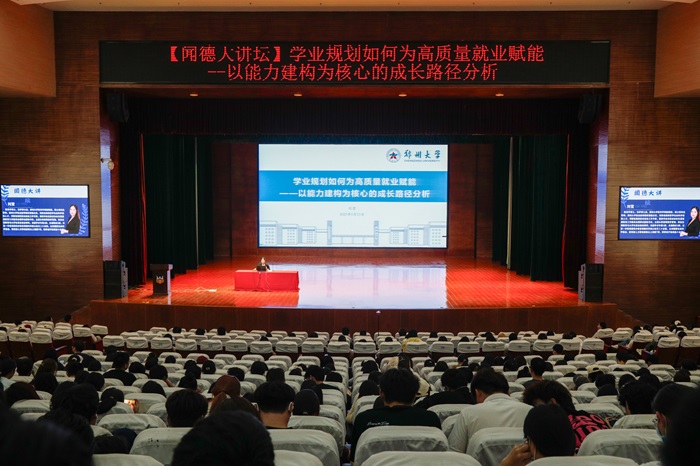 聘任仪式结束后,刘*在闻德礼堂开展 《学业规划如何为高质量就业赋能——以能力建构为核心的成长路径分析》的主题讲座。讲座伊始,刘*运用三个真实案例引发学生兴趣,这些案例展示了多样化的成功路径,指出无论起点如何,通过科学的职业生涯规划和持续努力,每个人都可以实现自己的职业目标。随后刘莹分别从“何为高质量就业”“学业规划与生涯发展”“数智时代的就业能力”“从‘为工作’到为‘为生活’”四个方面,结合前言数据、真实案例等,深入浅出地阐述了职业规划的重要性和实践路径。