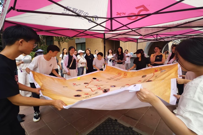 “重走长征路”挑战赛更是将团队协作精神展现得淋漓尽致。比赛分为4-8人一组,同学们通过协作调整画布角度,引导“红军”网球沿长征路线前进。在这一过程中,同学们不仅考验着团队默契,更在互动中感悟坚韧不拔的长征精神。当5支队伍凭借出色配合率先“会师延安”时,现场爆发出热烈的掌声和欢呼声,他们赢得了荣誉,更收获了团结的力量。