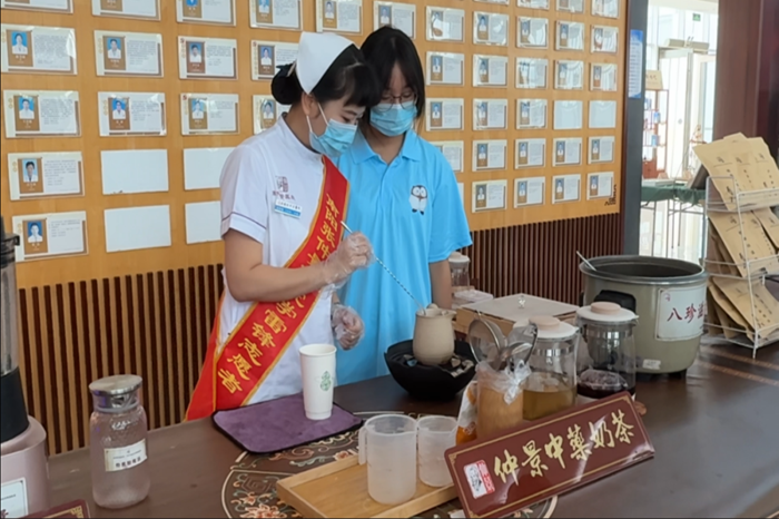 踏入南阳张仲景医院,队员们便闻到一股草药和奶香混合的味道。随后来到仲景养生茶台,指导老师为成员们演示了古法酸梅汤的制作过程。通过老师操作时的讲解,团体成员了解到古法养生饮的