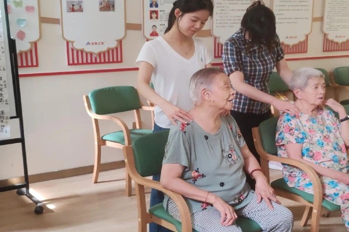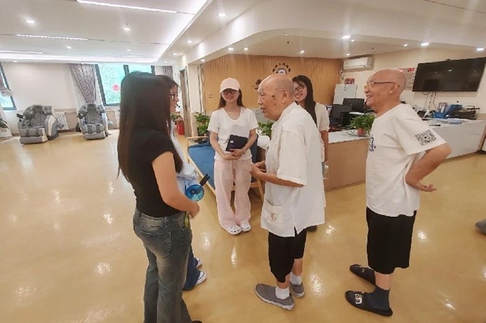 在健康宣传过程中,实践队员们不仅耐心讲解养生知识,还为老人进行了舒缓按摩。手法虽稍显青涩,却饱含着十足的认真,从肩颈到腰背,细致的揉捏动作,换来老人们舒展的笑容和连连称赞。
