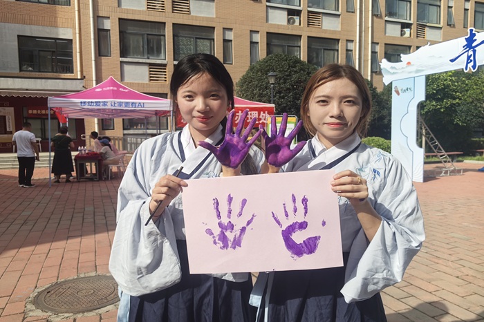 “看我的手印!”“投中了!”“耶耶耶,我答对啦,有小礼品呀!”崇德书院社团市集正在如火如荼的进行,甘棠汉服社的汉服体验、投壶挑战;国际舞社举办知识问答与成果展演;墨雅诗词社开展书法体验与诗词盲盒等活动。新生们穿梭于各个摊位之间,或凝神参与传统文化体验,或雀跃欢呼于互动游戏的成功。笑语欢声与飞扬的青春气息交织,汇成开学日最动人的乐章。此次市集为新生搭建了探索兴趣、融入校园的平台,助力其开启多彩校园生活。
