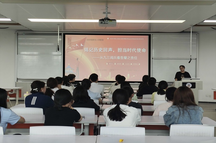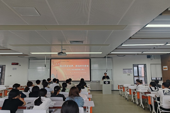 9月12日,崇德书院特邀马克思主义学院学业导师王桂琴为2025级护理学及医学检验技术专业新生开展了一场主题为“铭记历史回声,担当时代使命——从九三阅兵看吾辈之责任”的入学思政教育讲座。70名新生齐聚弘学楼E301教室,在历史的回望与时代的召唤中,开启了大学阶段具有重要意义的第一课。
