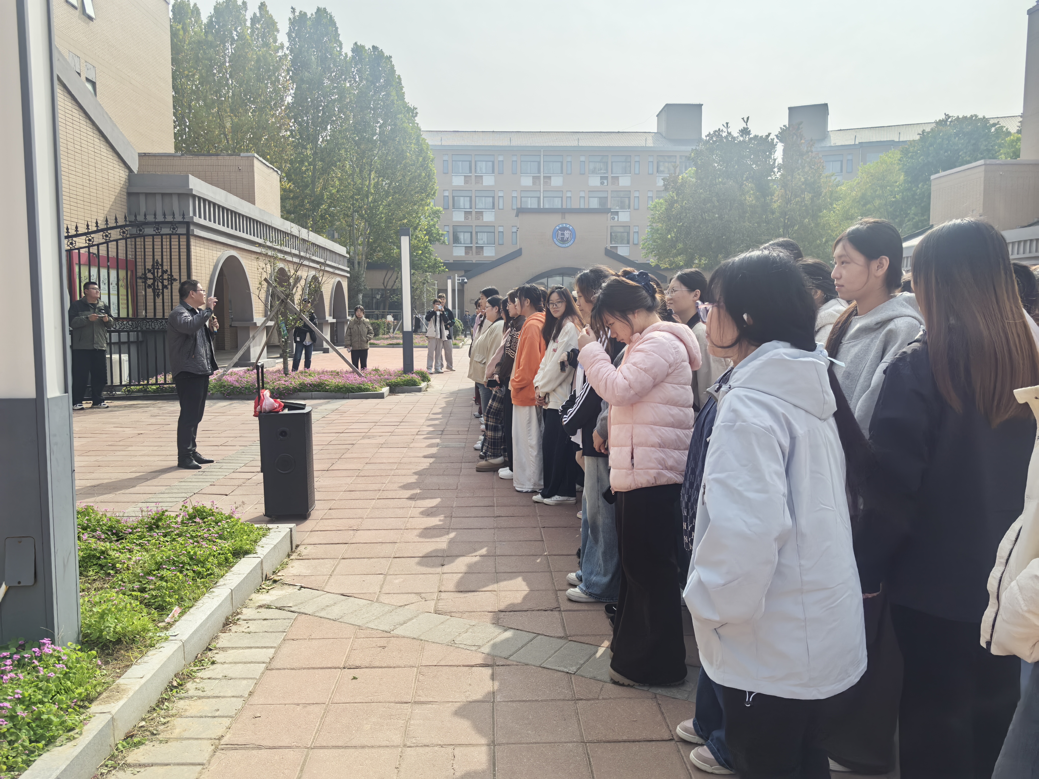 疏散环节结束后,消防教员张*老师对演练情况进行复盘点评。他首先梳理了本次疏散的整体流程,肯定了师生快速响应、有序撤离的良好表现;随后结合现场记录,指出了疏散过程中存在的个别学生动作迟缓、部分区域衔接不够紧凑等问题,并针对性强调:“疏散时务必保持镇定,严格遵循引导,切勿慌乱推挤;撤离后要迅速清点人数,确保无一人遗漏。”同时,张*老师还结合高校宿舍火灾案例,再次重申了杜绝违规电器、保持疏散通道畅通等日常防火注意事项,强化师生安全意识。