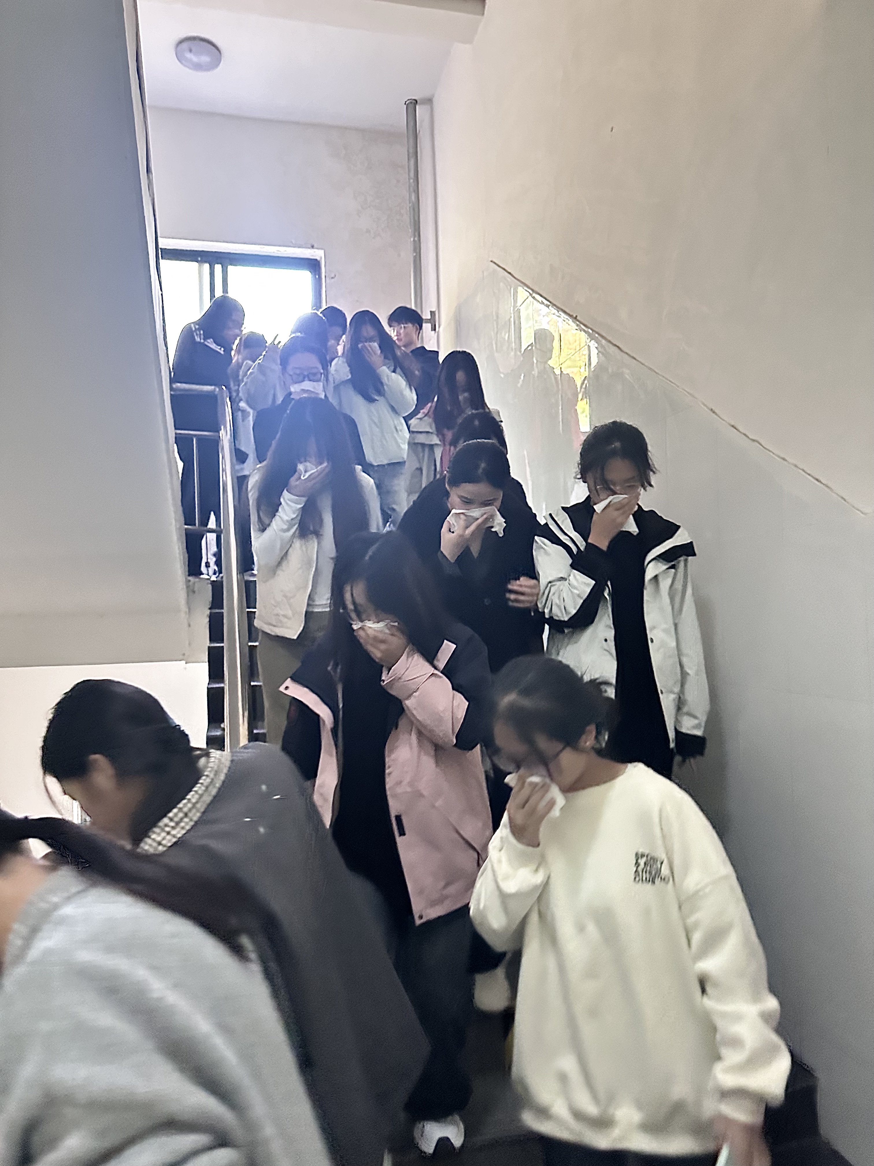 10月31日,本次演练正式开始,在崇德U型南楼与崇德U型北楼依次启动。随着烟饼的燃烧和急促的口哨声,消防演练正式开始。宿舍楼内师生迅速响应,在辅导员和志愿者的引导下,用湿毛巾捂住口鼻,采取弯腰低姿的防护姿势,沿安全出口指示标识向指定集结点快速撤离。各重点区域值守人员及时疏导人流,有效避免拥挤情况发生。最终,崇德U型南楼用时1分57秒完成全员疏散,崇德U型北楼仅用1分40秒便实现全员安全撤离,整个过程规范有序,达到预期效果。2023级学生王*华表示:“警报声响起的瞬间真的很有紧迫感,这次演练让我直观掌握了逃生要领,比书本上学到的更深刻。”