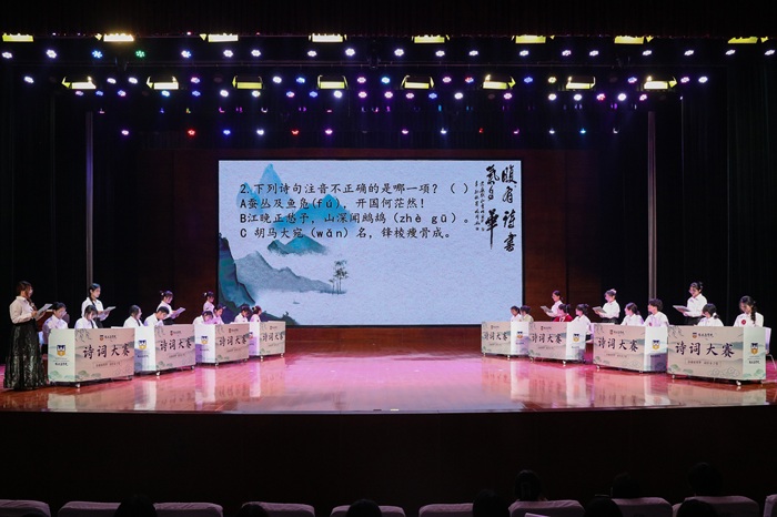 随后,赛事进入紧张激烈的角逐环节。第一轮“情系家国·雅韵争锋”中,16名选手同台展开限时笔试对决。本轮赛题涵盖选择题与填空题两大类型,充分考验选手的诗词储备与即时反应能力。在紧张激烈的答题过程中,选手们或凝神思索,或挥笔疾书。现场观众也随着赛况起伏屏息凝神——每当选手亮出正确答案,台下便响起热烈的掌声与赞叹;偶有遗憾失误,观众席中亦传来阵阵鼓励的轻叹。最终,依据个人累计积分进行排序,总分排名前12位的选手成功晋级,进入下一轮角逐。紧张赛程中穿插的抽奖环节,适时缓解了白热化的气氛,瞬间点燃了全场热情。