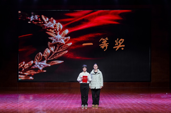 经过数轮激烈比拼,大赛各奖项尘埃落定。田华曦荣获一等奖;张思源、李幽荣获二等奖;任金缇、高远怡、魏畅荣获三等奖,参会领导为其颁奖,台下掌声雷动,为获奖选手送上最诚挚的祝贺。参赛选手田华曦在赛后深情分享:"站在诗词的舞台上,我感受到的不仅是竞技的张力,更是一种文明的接力。当我们吟诵'家国山河'时,千年的文化血脉仿佛在此刻苏醒;当'少年'诗句响彻礼堂,我听见了历代先贤对青春中国的不灭期许。这不止是一场比赛,而是一场跨越时空的精神对话,让我们在平仄韵律中读懂民族的脊梁,在字句铿锵中铸就时代的担当。"
