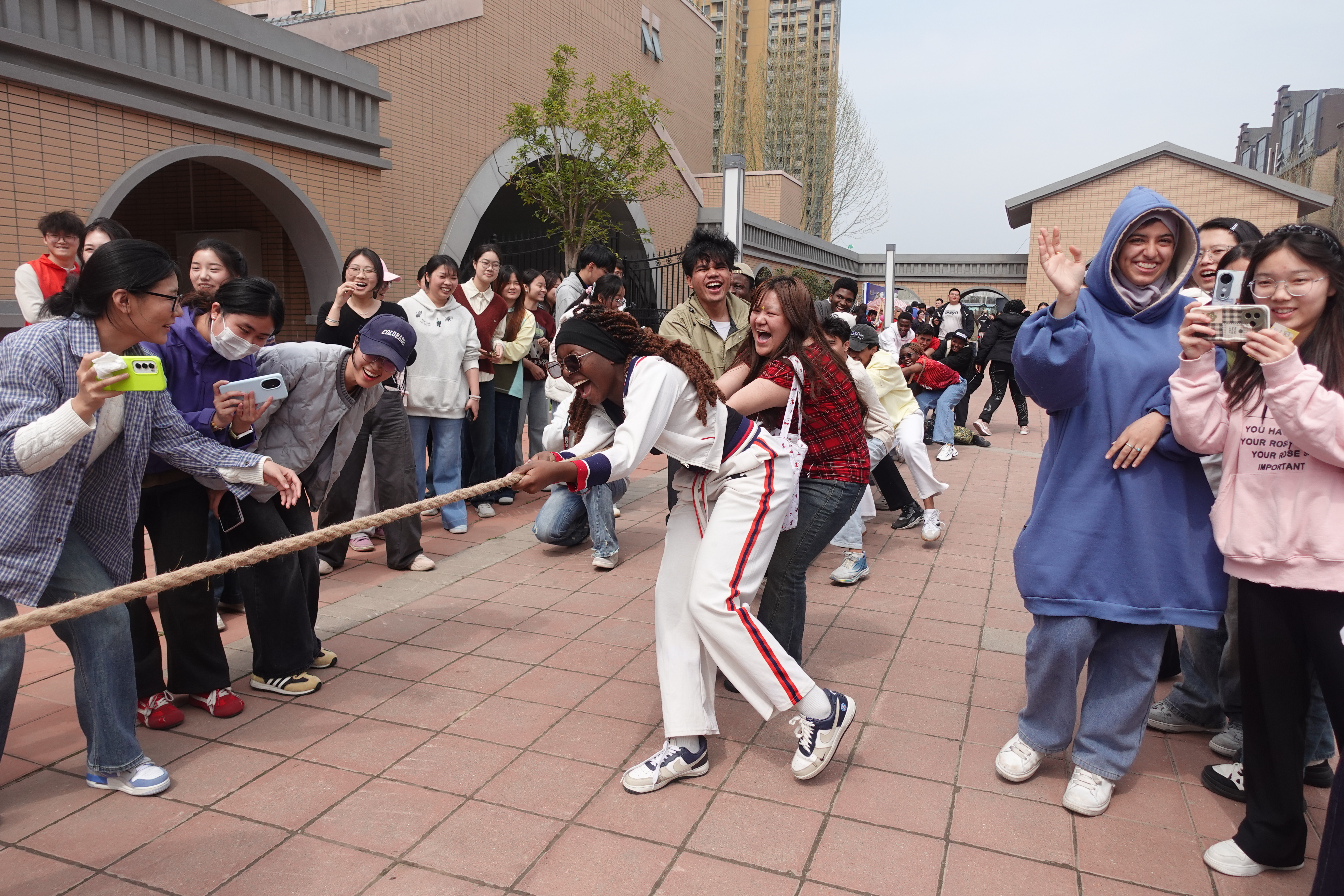 要说全场最吸睛的环节,当属趣味拔河比赛。全校33支小队摩拳擦掌、同台竞技,队员们心往一处想、劲往一处使,咬紧牙关奋力比拼,尽显团结拼搏的少年风采。师生联队和国际留学生队的对决,更是把气氛推向了最高潮,双方紧握长绳、奋力后倾,整齐的口号声响彻校园。最终比赛以友谊收尾,中外师生在较量中拉近了距离,相处得格外融洽。